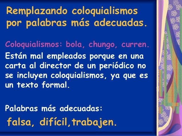 Generalmente, solemos expresarnos de forma espontanea. A veces, utilizamos determinantes palabras y expresiones solo ate persona de confianza. Esos términos se denominan coloquialismos. Por ejemplo: La función ha estad guay. Los coloquialismos no deben usarse en situaciones formales. No hay que confundir los coloquialismos con los vulgarismos. Los vulgarismos son palabras o expresiones que no deben utilizarse nunca porque son incorrectas. Por ejemplo, cocreta (por croqueta). También son propios del lenguaje vulgar algunos errores como utilizar el artículo delante del nombre propio. por ejemplo: se dije a la Paula (por Se lo dije a Paula).